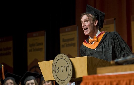 Bill Nye, well-known scientist, environmental advocate and TV personality, offered up the keynote address at Academic Convocation on May 25, which served as the kickoff to a weekend of commencement-related activities at RIT. He challenged graduates to use their intellect and passion to correct the mistakes of previous generations, particularly when it comes to the issue of global warming.