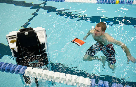 Jordan Darling brings his Jet Ski into the RIT pool to demonstrate the Retriever, a beacon to help locate a submerged personal watercraft. The bright pouch floats above the water and is connected to the vehicle with a 50-foot rope and can save thousands in search and retrieval costs.