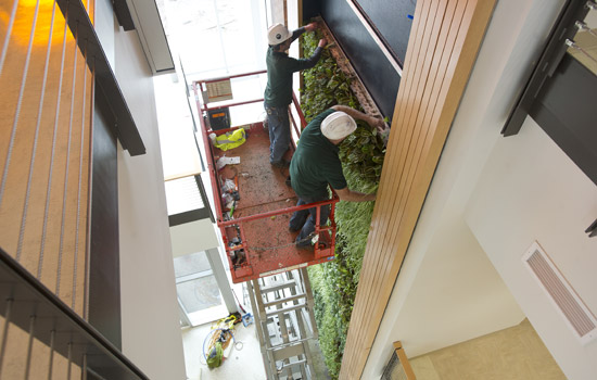 Workers install the nearly 40-foot tall green wall at Sustainability Institute Hall on March 7.