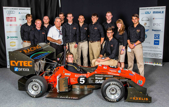 People gathered around race car The 2013 RIT Formula Race team was recognized for its outstanding, lightweight car design at the recent SAE Formula Student Germany competition in August. Standing left to right: Nicholas Ryan, Kevin Ferraro, Travis Newberry, Alan Nye (mechanical engineering professor and team adviser), Sal Fava, Phil Vars, Aaron League, Tim Moran, Kyle Abbott, Tyler Peterson, Jaclyn Pytlarz, Kevin Albino and, seated in car, Brian Guenther. Provided by Formula Student Germany