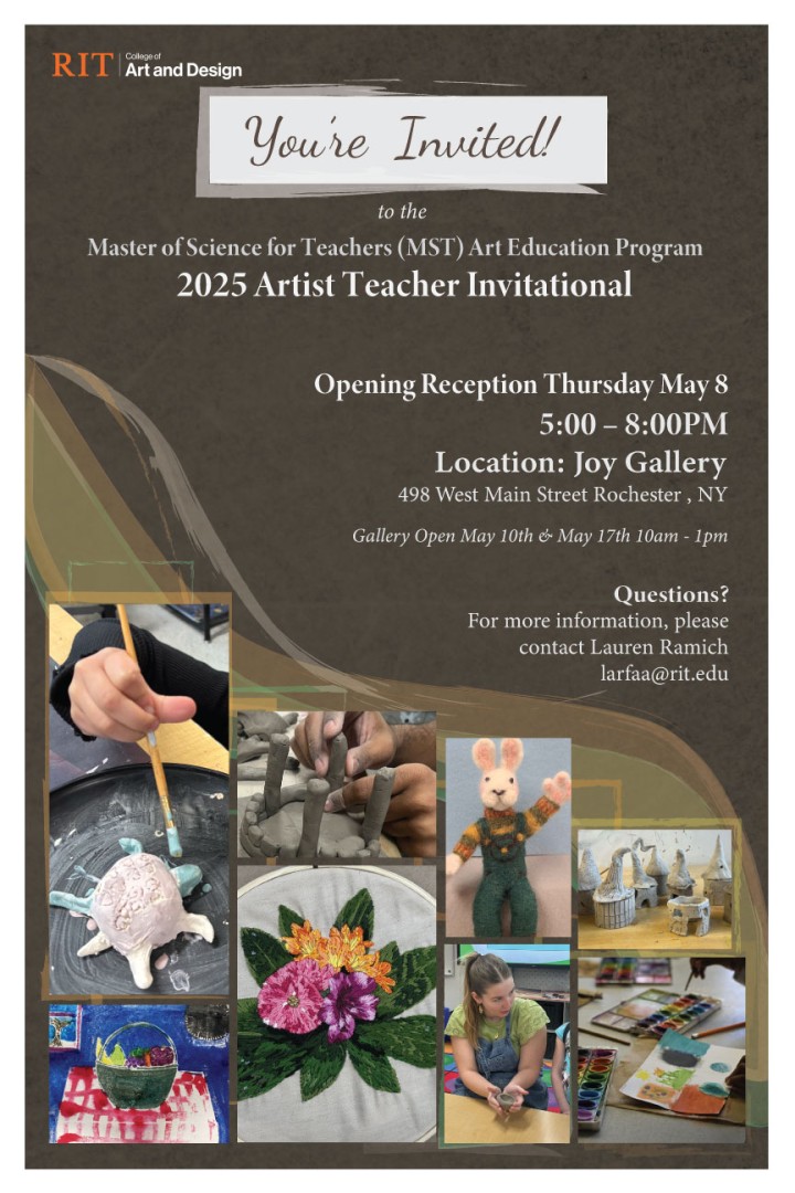 RIT's visual arts-all grades MST program is hosting its annual Artist Teacher Invitational at Joy Gallery (498 West Main St., Rochester 14608). The exhibition is a showcase of work by K-12 students the RIT artist teachers taught throughout the academic year.
