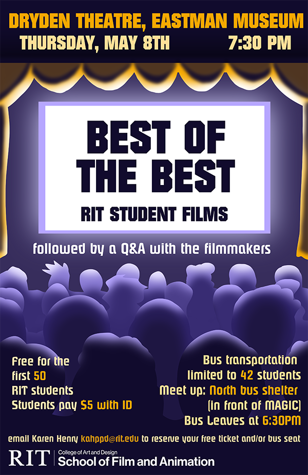 RIT's School of Film and Animation presents the best live-action and animated student films made this academic year during a screening at Dryden Theatre, located at the George Eastman Museum (900 East Ave. Rochester, N.Y. 14607). A Q-and-A with the filmmakers will follow.