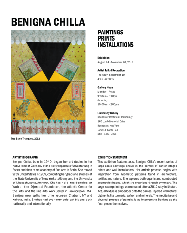 Benigna Chilla (b. 1940), began her art studies in her native Germany at the Folkwangschule fuer Gestaltung in Essen and then at the Academy of Fine Arts in Berlin. She moved to the United States in 1969, completing her graduate studies at the State University of New York at Albany and the University of Massachusetts, Amherst.