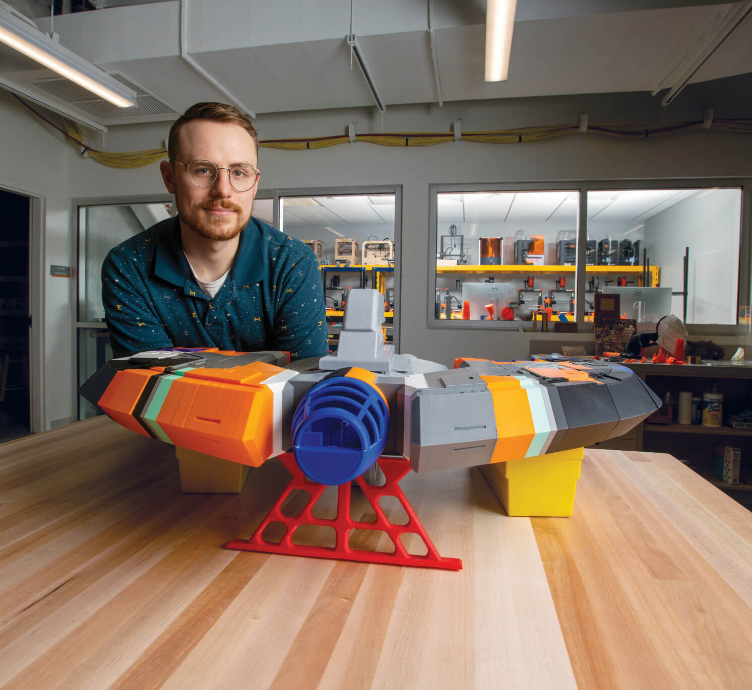A fan of Star Wars, Jordan Williams, a fourth-year mechanical engineering technology major from Williamson, N.Y., made more than 50 pieces on 3D printers over two semesters to construct an Ahsoka T-6 Jedi shuttle, which has a wingspan of nearly 3 feet when assembled. He also 3D printed hilts for lightsabers. He estimated the total printing of the items took 10 days.