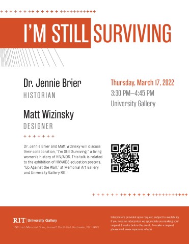 March 17, 3:30-4:45 in person at RIT’s University Gallery, historian Dr. Jennie Brier and designer Matt Wizinsky will speak about their collaboration, “I’m Still Surviving,” a living women’s history of HIV/AIDS.