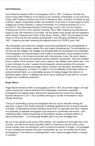 Chiarenza is Artist-in-Residence, and Fanny Knapp Allen Professor Emeritus of Art History, at the University of Rochester. He was Fanny Knapp Allen Professor there (1986-1998). At Boston University (1963-1986), he was Chairman, Director of Graduate Studies, and Professor of Art History. He also taught at Smith College and Cornell University. Born 1935, in Rochester NY, he received an A.A.S. (1955) and a B.F.A. (1957) from Rochester Institute of Technology, a M.S. (1959) and A.M. (1964) from Boston University and the Ph.D. from Harvard University in 1973. Chiarenza has lectured and taught workshops at over 100 institutions in 33 states since 1966. His photographs have been seen in over 80 one-person, and in over 250 group exhibitions since 1957.