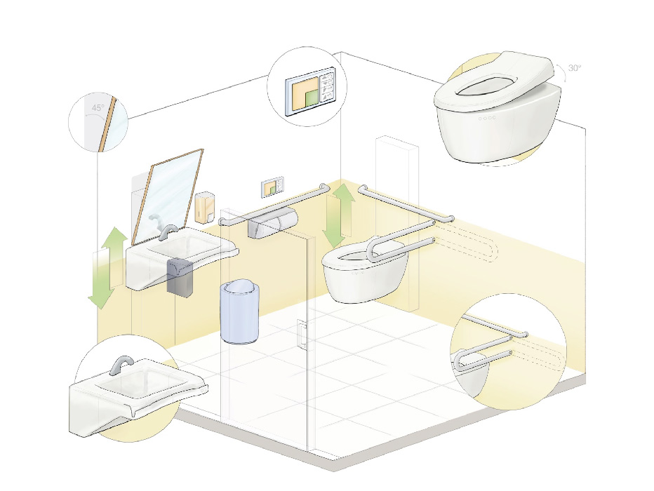 Currently, accessible public lavatories at healthcare facilities, although functional in aiding people with mobility impairments, are alienating to users. They highlight the user's disability more so than their abilities with bulky attachments resulting in a rather odd appearance. This causes the targeted users to feel disheartened even in the most basic activity. So how can a lavatory be designed that is functional and also universal?