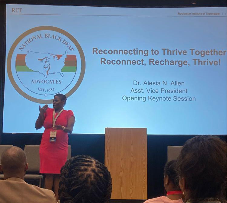 The National Technical Institute for the Deaf (NTID) was well represented at the National Black Deaf Advocate Conference (NBDA) in Birmingham in August. Alesia Allen, assistant vice president for NTID Diversity and Inclusion delivered the keynote address during the opening session entitled “Reconnecting to Thrive Together: Reconnect, Recharge, Thrive!” Allen was introduced by NTID President Gerard Buckley. Bakar Ali and Kemroy Campbell, fellows in the NTID Faculty Fellowship program, served as workshop presenters and their joint presentation, ChatGPT: The Promising Potentials of Artificial Intelligence for Deaf People” won an award for being one of the most highly attended sessions.