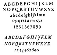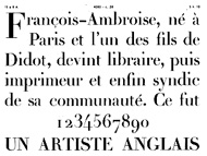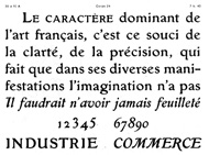 From 1900 to 1914, Georges' primary interest was to create faces that were indicative of the new century. He did so by commissioning the artist Eugène Grasset (1841-1917) to design "Grasset," a face that would be an international success through exposure at the World Exposition of 1900.[17] Georges also worked with Georges Auriol (1863-1938) to realize the Nouveau typefaces "Auriol" and "Robur." "Auriol" is most notably seen today in the signage that marks staircases leading down to the Paris Métro line. Following his father's trend, Georges purchased the punches of the Fonderie Générale in 1912, thereby acquiring the historic "Didot" faces. The following year, the company released the "Cochin" and "Moreau-le-Jeune" faces that revived the popularity of eighteenth century letterforms such as those originally created by Nicolas Cochin.[18] The firm also began modern recuttings of the Imprimèrie Nationale's "Garamond," which was based upon Jean Jannon's seventeenth-century interpretation of Claude Garamond's sixteenth century work (figs. 4-9).[19]