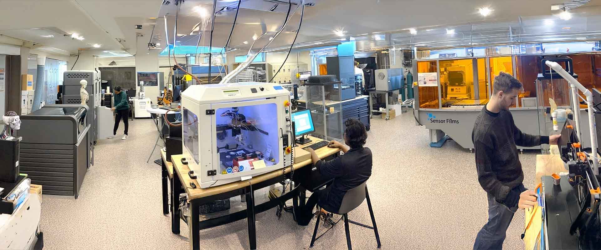 A panorama view of the AMPrint lab from a slightly elevated position. Various machines are being operated by a few people.