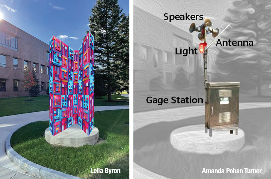 Outdoor Sculpture: between Scylla and Charybdis, pole-mounted aluminum enclosure with electronics, solar panels, aluminum QR code signage, audio livestream. Visible on the north lawn of Booth/Gannett Halls, RIT Campus.