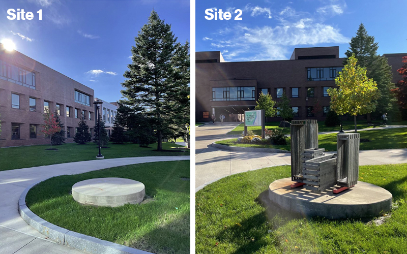 Outdoor Sculpture: Craters of the Moon Fold Back, UV photographs on weathering steel, 8'h x 2.5'w x 4.5'd. Visible on the north lawn of Booth/Gannett Halls, RIT Campus.