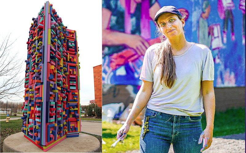 Outdoor Sculpture: Quilt, painted wood, 2022. Visible on the north lawn of Booth/Gannett Halls, RIT Campus.