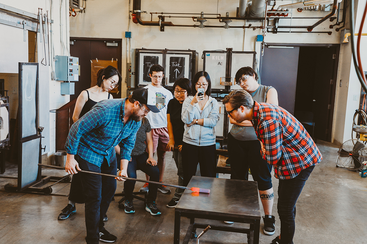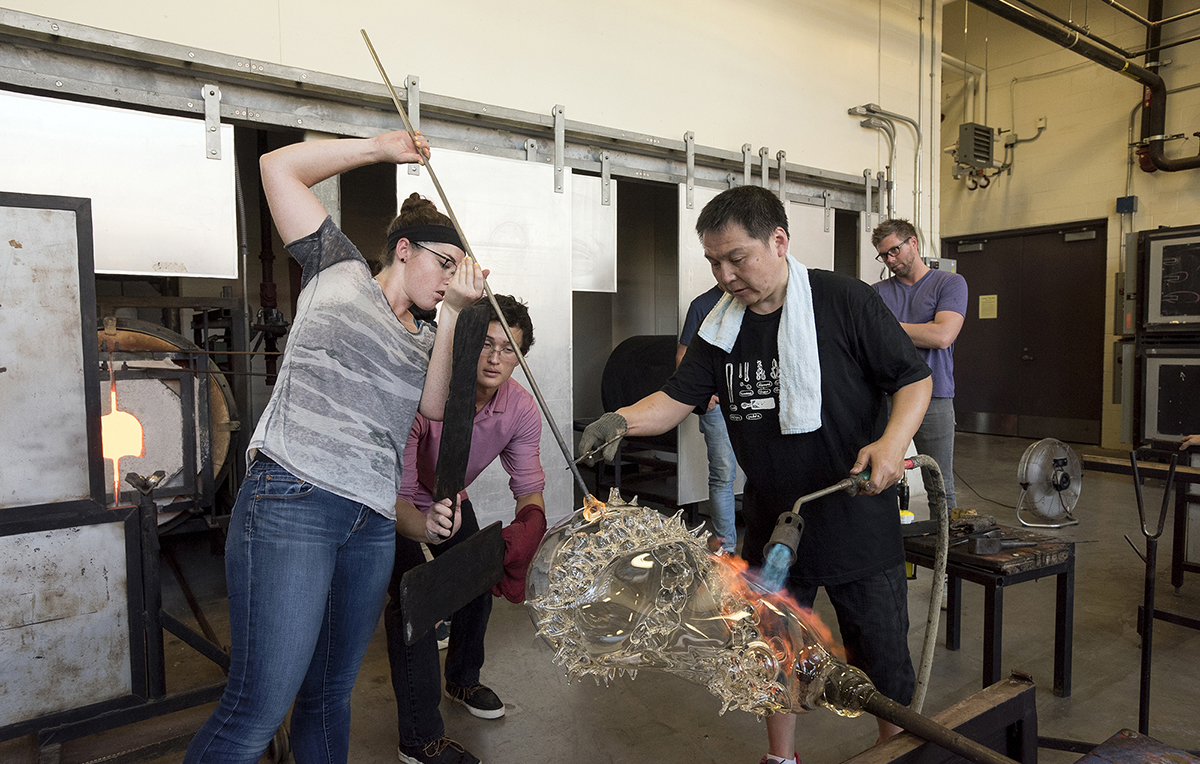 Japanese glass artist Masahiro Sasaki, seen here working in the hot shop with RIT Glass students, was hosted by the program for a series of talks and studio demos. Sasaki's work has been exhibited and collected around the world, and he teaches and heads the glass program at Aichi University in Japan. Photo by A. Sue Weisler.