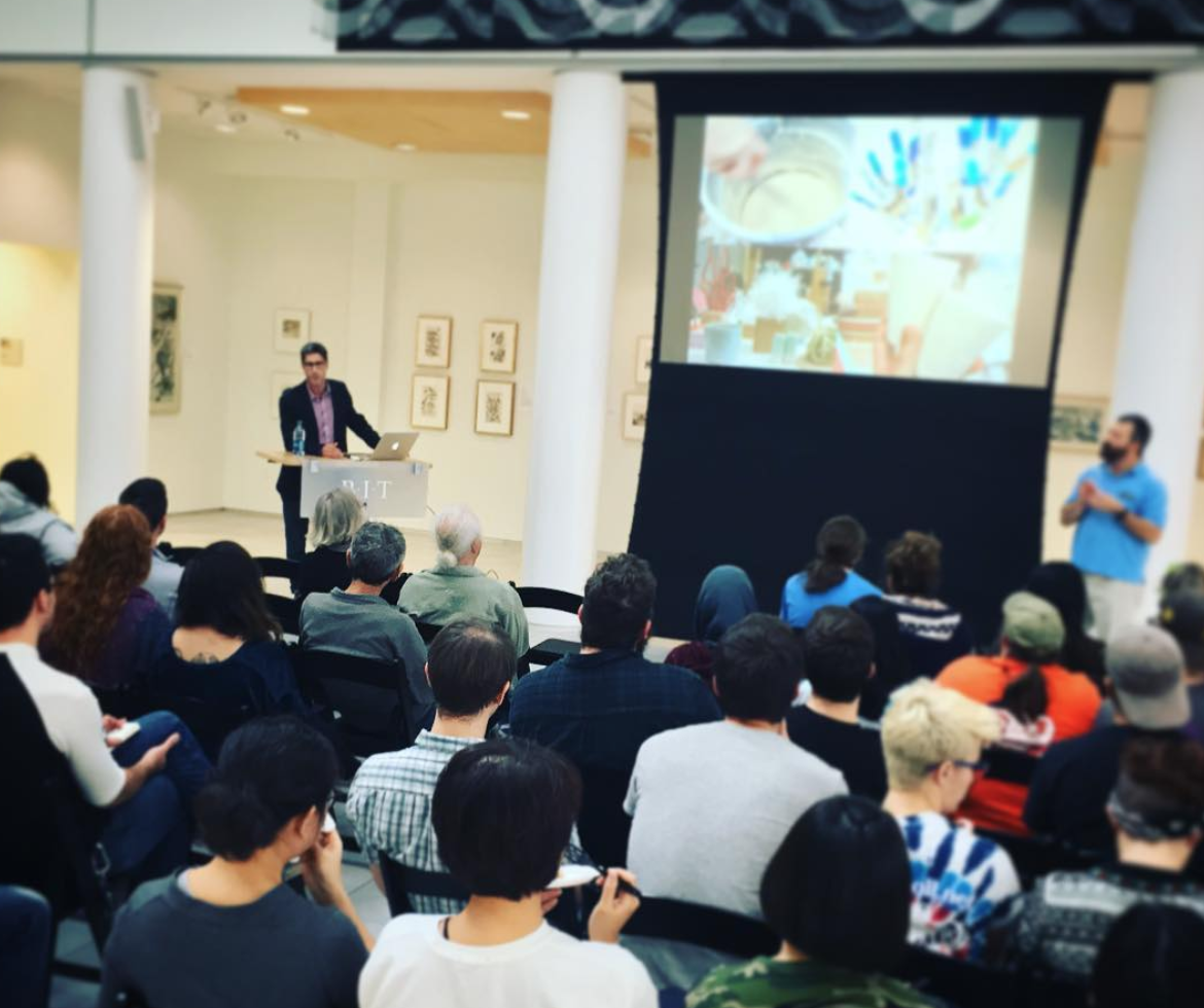 Printmaker Charlie Cohan was at RIT in early 2018 for an artist talk and a pair of demos that merged glass, kiln forming and screen-printing. Cohan is a professor and the printmaking chair at the University of Hawaii at Manoa.