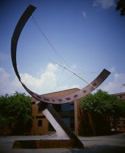 Alistair Bevington, although best known for his collaborations with his wife Mariette in stained glass creations, was also a sculptor. Bevington trained as an architect at Cambridge, and practiced architecture upon moving to the United States. His contribution to RIT's campus, the sundial in the dormitory courtyard, was installed on the current Henrietta campus in 1968.