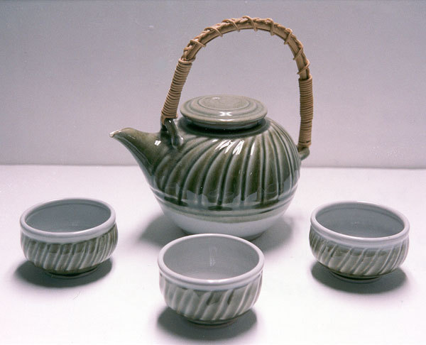 tea pot: 9 3/4" x 9" x 6 1/2" cups: 2 1/4" x 3 1/2" x 3 1/2"