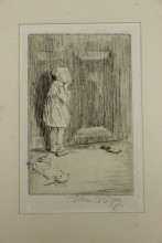 Eileen Soper (1905-1990) was born in Enfield but lived the great majority of her life at Harner Green near Welwyn in Hertfordshire, England. The daughter of illustrator George Soper, she was only fifteen when her work was first accepted by the Royal Academy. She specialized primarily in animals and children, and was a founding member of the Society of Wildlife Artists. Soper painted watercolors and illustrated many books, including "The Famous five" series by Enid Blyton. Soper was elected to the Royal Society of Miniature Painters in 1972George Soper was obsessive about germs, and, as they grew older, Eileen and her sister became obsessed with the idea that the Dread Disease (i.e. cancer) could be caught from coughs and sneezes. They became recluses. Servants and gardeners who retired or died were not replaced in case the newcomers imported the Dread Disease, and their 4-acre garden became a wild, overgrown nature reserve. Provisions were ordered by telephone and delivered to the garden gate so that they did not have to meet shop-keepers. Both sisters lived to be over 90 and died within a few months of each other