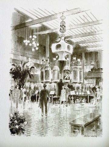 Midtown Plaza: (interior clock tower) Art Images Artist Ralph Avery Type Reproduction (Lithograph) Size 13 1/4" x 10 1/4" Available to Loan No