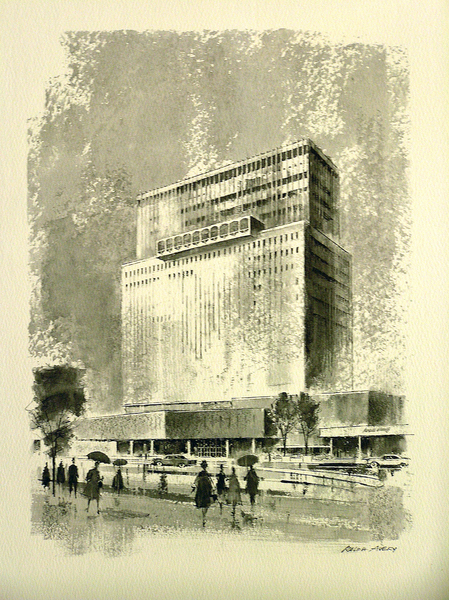 Midtown Plaza: (exterior from street) Art Images Artist Ralph Avery Type Reproduction (Lithograph) Size 13 1/4" x 10 1/4" Available to Loan No
