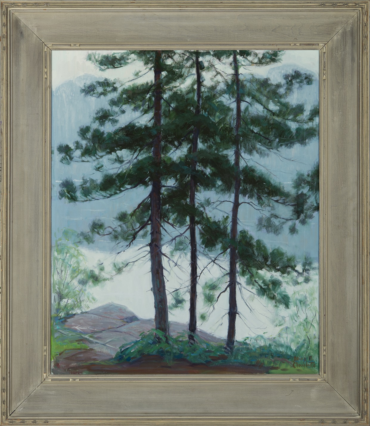 Oil painting featuring three pine trees and a misty background.