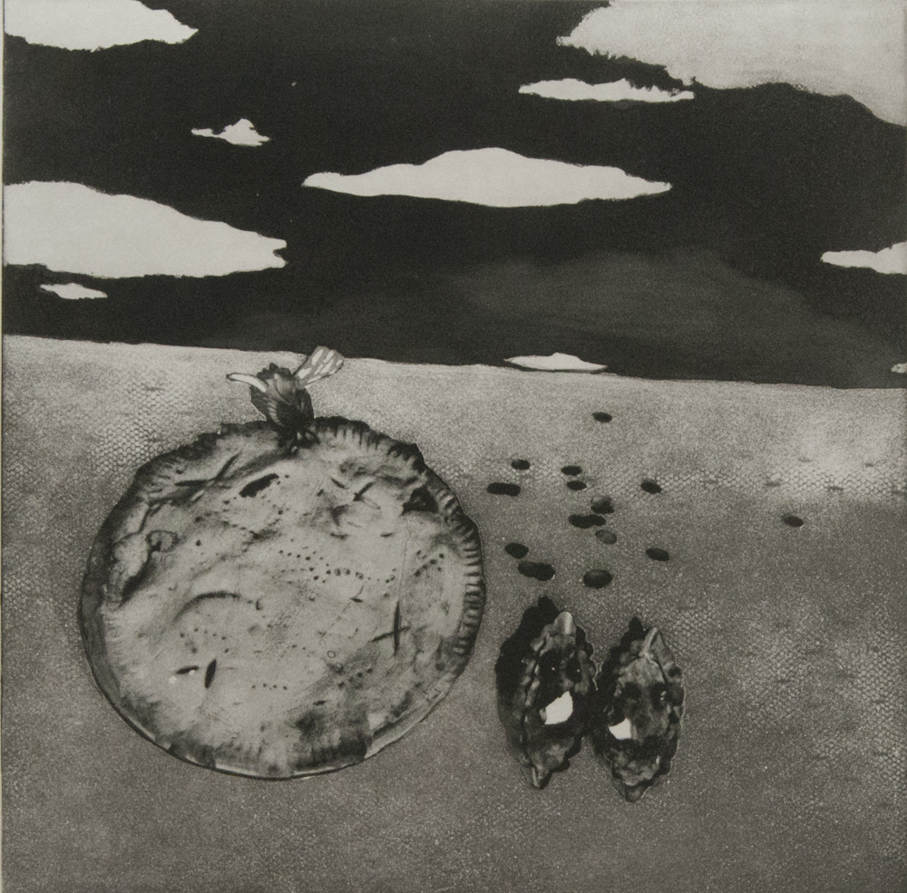 Pie and Sky Art Images Artist Bea Nettles Type Photograph Year 1985 Size 15"x9.5" Notes Photographic collage of pie, bee, and sky.
