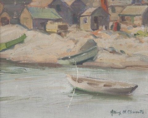 Oil painting of rowboats along a shore completed in blues and gray.