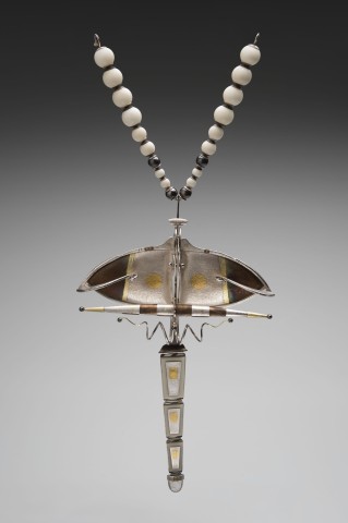 Necklace created using sterling silver, copper, 18k, 14k and 24k gold, delrin, bronze, rutilated quartz, and black pearls.