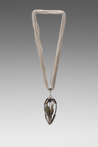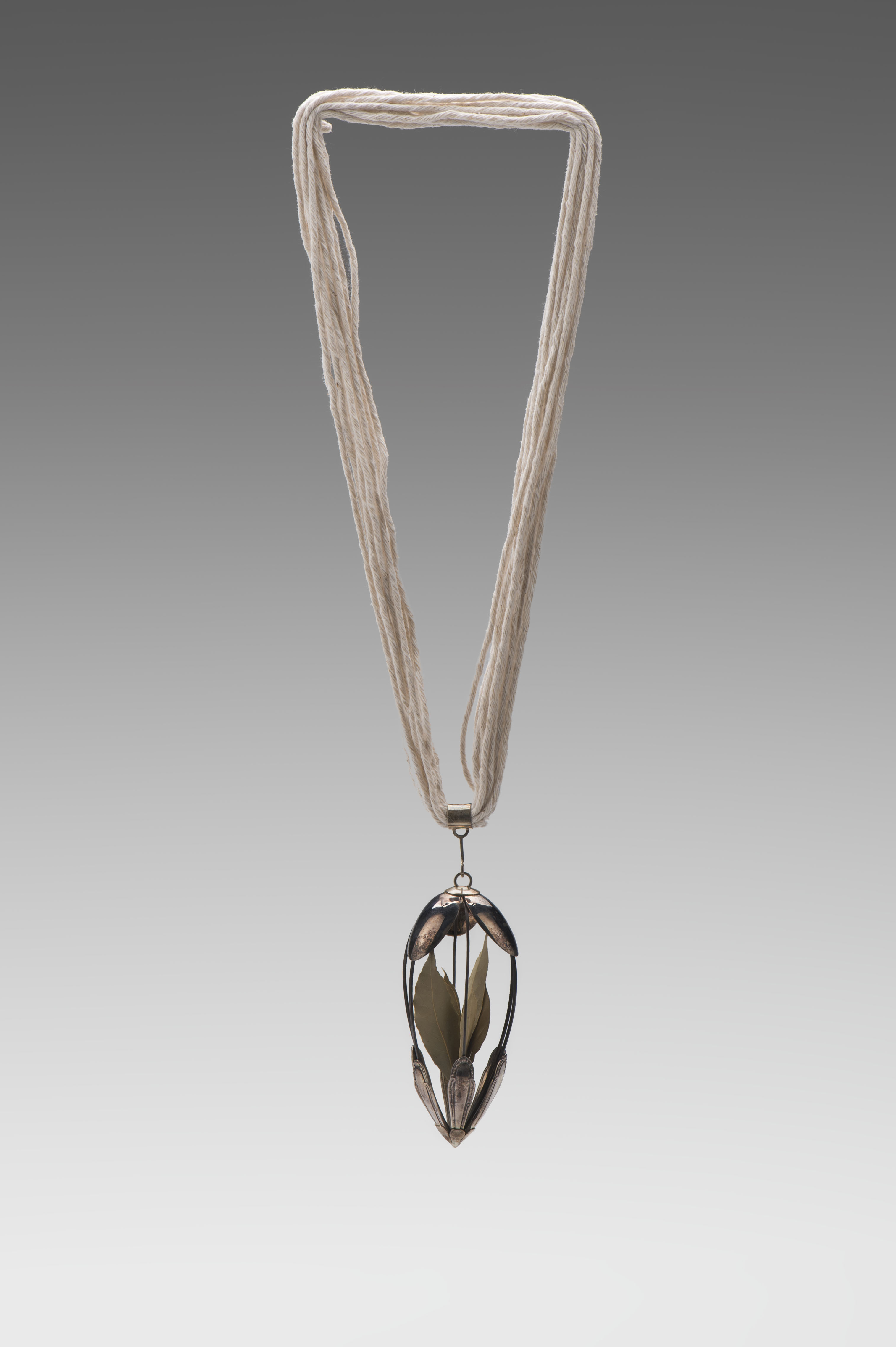 Oxidized silver necklace made from silver spoons and silver bars. The chain is made of cotton string and the cage contains bay leaves.