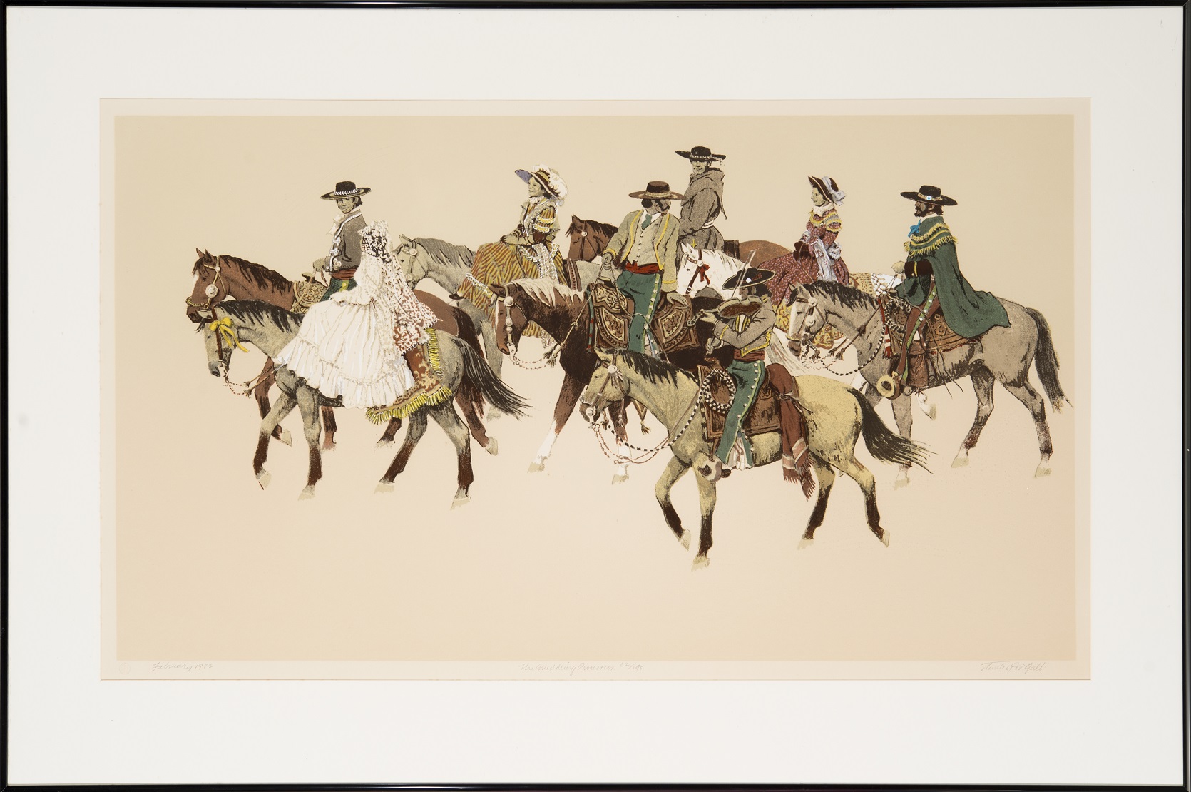 A signed print on serigraph paper of a Mexican bride and groom and their wedding party on horseback. Numbered 62/195.