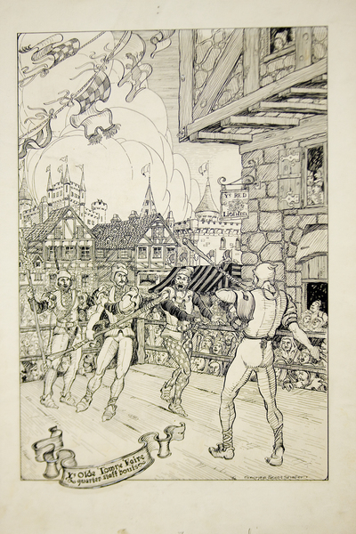 Ye Olde Town Faire - quarter staff bouts - Art Images Artist George Scott Shafer Type Drawing Size 21 X 14 ??