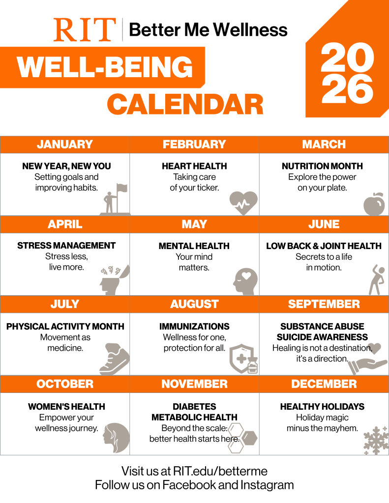 Better Me provides comprehensive, innovative health and wellness services and resources to RIT employees that encourage self-efficacy, enhance employee engagement, and enrich a sense of purpose and belonging, both personally and professionally.