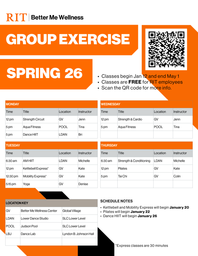 - Retirees, Alumni, and family members of RIT Employees are eligible to take classes with an active recreation membership
