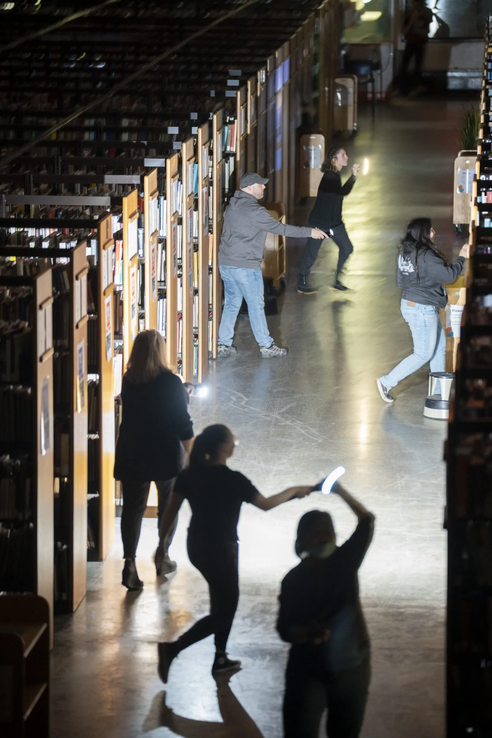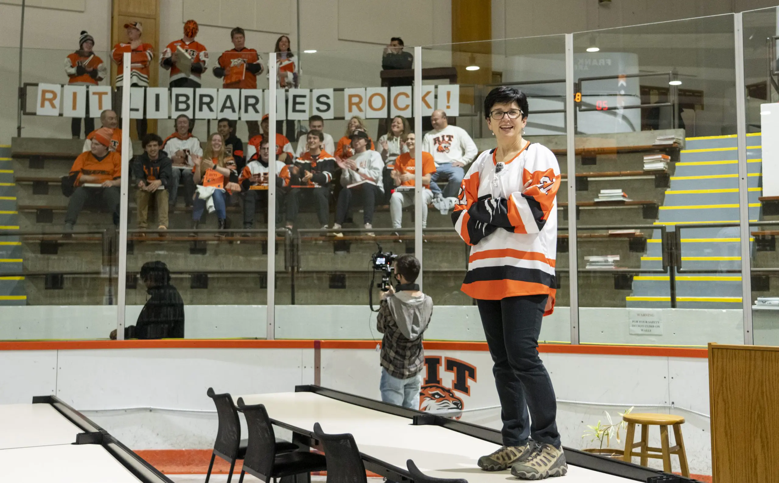 “The weeks of planning paid off as community members from all over RIT came together to create this once-in-a-lifetime image of our beloved Ritter Arena serving as the library, affectionately called ‘Wallace on Ice,’” added Eric Kunsman, an assistant professor for the visual communications studiesdepartment in the National Technical Institute for the Deaf and an adjunct professor in SPAS.