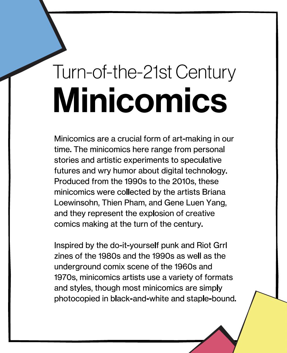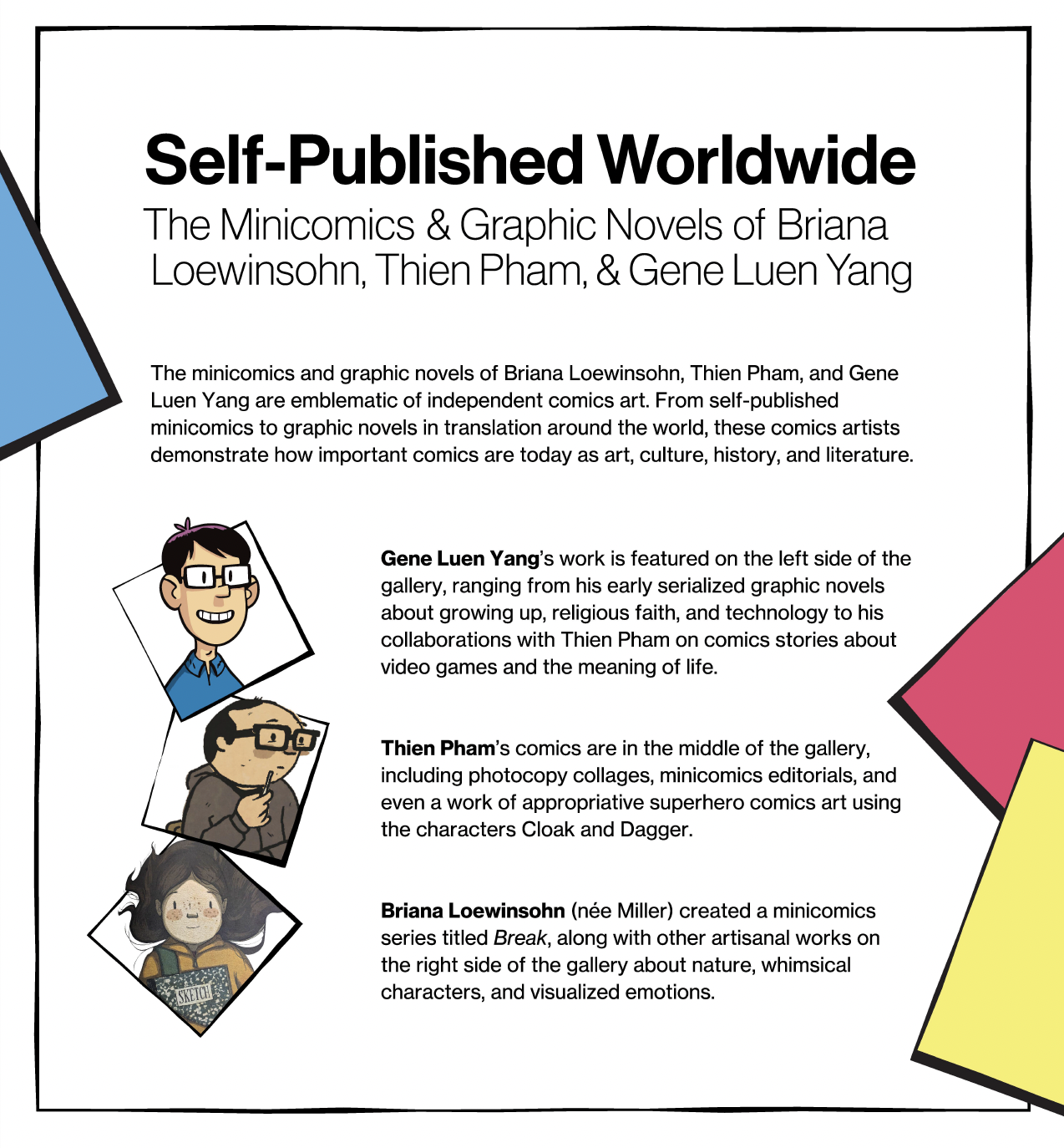 Briana Loewinsohn, Thien Pham, and Gene Luen Yang create comics and graphic novels, and like many comics artists, they each got their start by self-publishing minicomics. In the 1990s and 2000s, self-published minicomics were often photocopied, staple-bound, black-and-white booklets. Artists made comics about anything and everything, from mundane happenstance to science fiction saga, and distributed them through the mail, at comics and zine festivals, and eventually through the internet.