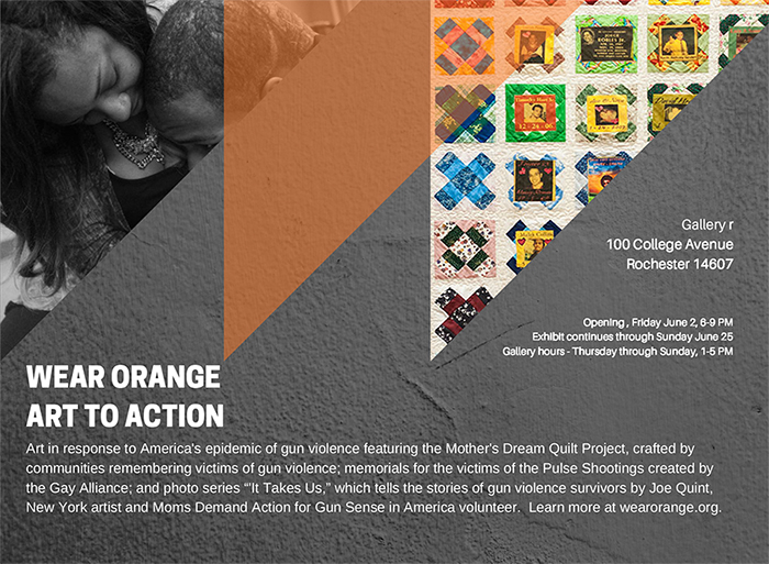 Gallery r presents “Wear Orange: Art to Action” – an exhibition highlighting National Gun Violence Awareness Month. The show includes The Mother’s Dream Quilt Project, crafted by communities remembering victims of gun violence; memorials for the victims of the Pulse Orlando Shootings created by the Rochester Gay Alliance; and It Takes Us, a photo series sharing stories of survivors by New York artist Joe Quint. Other events will occur in Rochester and beyond on June 2 as part of National Gun Violence Awareness Day. #wearorange
