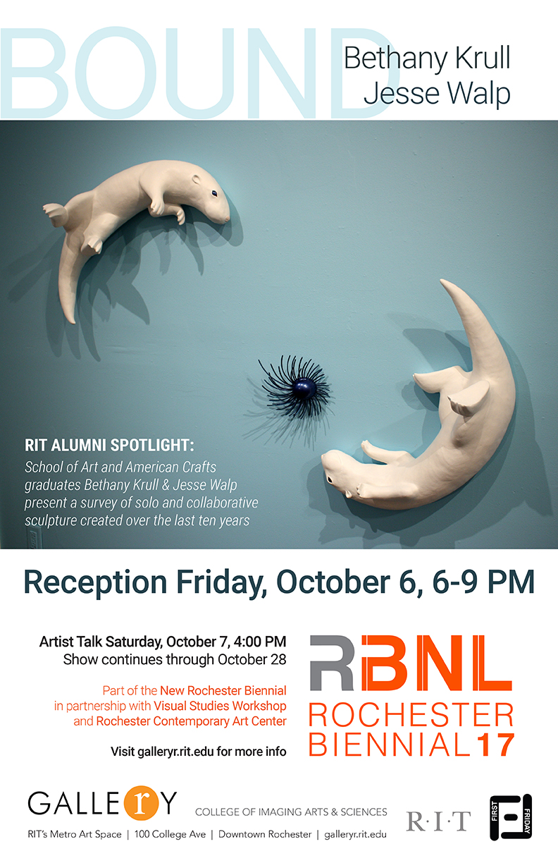 Bethany Krull is a 2007 graduate of the Ceramics program at RIT, and her work consistently addresses the complicated and contradictory relationship between humans and animals. She has exhibited her work nationally and is part of collections at the Burchfield Penny Art Center in Buffalo, NY and the Meadows Museum in Shreveport, LA. Krull currently resides in Buffalo and teaches ceramics and art foundations classes. “Returning to Rochester to show at RIT’s downtown art space is a great opportunity for me,” says Krull. “After graduating from the MFA program in Ceramics ten years ago, I’m looking forward to exhibiting in Rochester at an RIT space again. The show will be a survey of works I’ve made over that time, along with select works by my partner Jesse Walp, whom I’ve collaborated with on several exhibitions.”