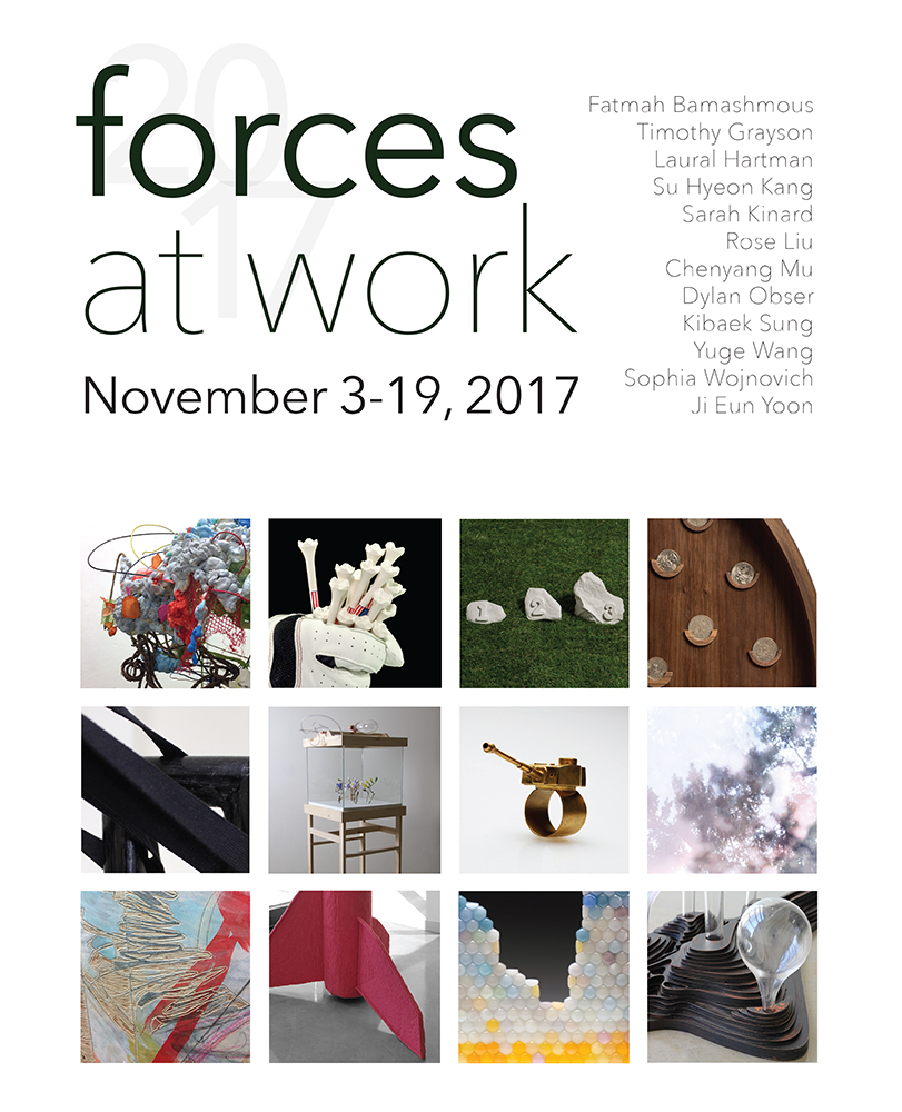 This year’s Forces at Work features Fatamah Bamashmous, Timothy Grayson, Laural Hartman, Su Hyeon Kang, Sarah Kinard, Rose Liu, Chenyang Mu, Dylan Obser, Kibaek Sung, Yuge Wang, Sophia Wojnovich, and Ji Eun Yoon.