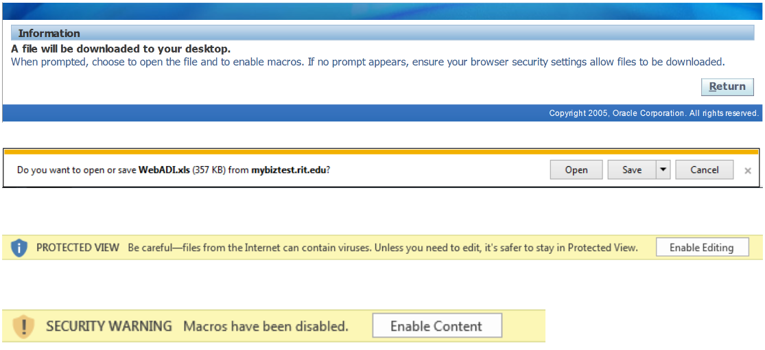 - Choose ‘open’ and enable editing and content macros in the Excel file