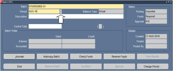 The Batch (RIT) screen opens. The system has automatically filled in the "Period" and "Balance Type" fields. - Make sure your cursor is blinking in the "Batch" field. In the "Batch" field, type in: