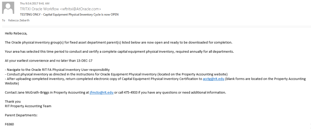 - An automated Oracle capital equipment physical inventory certification email will be sent to the supervisor on record for the inventory department parent.