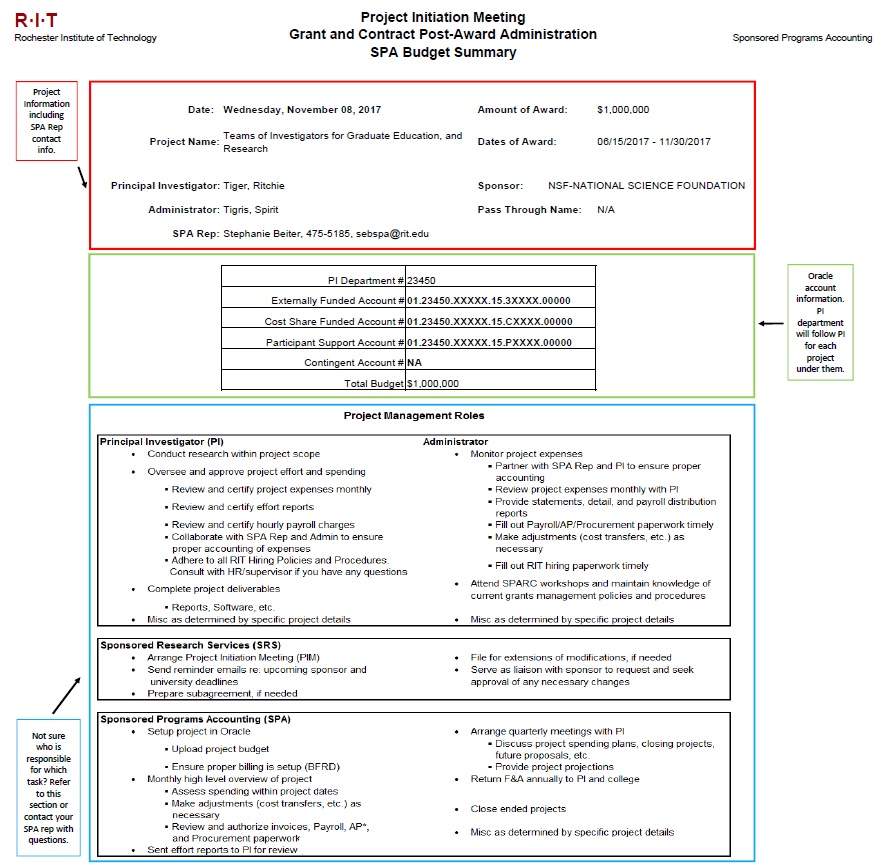 SPA and SRS conduct a Project Initiation Meeting (PIM) once a project account has been established. The PI, project administrator, SPA and SRS reps will be in attendance. We will review the award's Terms & Conditions (SRS) and the project budget (SPA). This is a great opportunity to ask questions, discuss project nuances, and become more familiar with any regulations that may apply to the project.