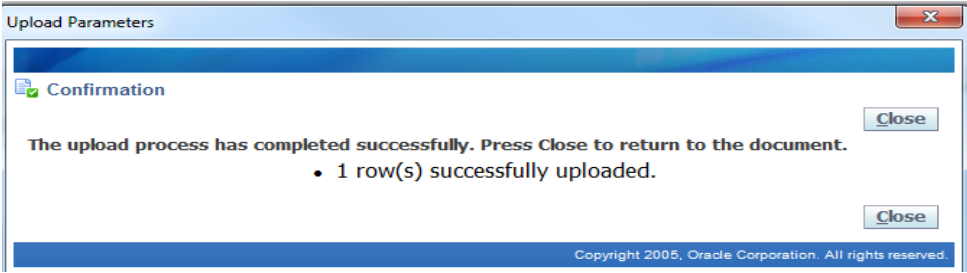 - Successful upload, you will see a message for the number of rows updated. Click on the Close Button.