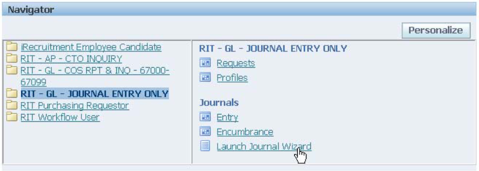 - On homepage navigator click the journal entry responsibility (e.g. “RIT – GL – JOURNAL ENTRY ONLY”)