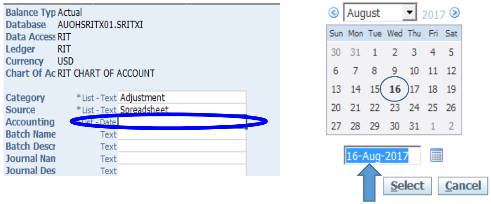 - Double-click on the Accounting data cell. A “Search and Select” window will open displaying a list of values to select from. The current date will be in bold. Adjust dropdowns to obtain desired period. Click on the desired date and click “Select”.