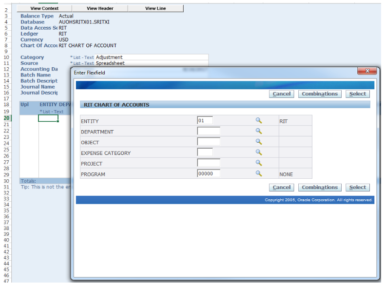 - Entity, Department, Object, Expense Category, Project and Program – These are the 6 segments that make up RIT’s 24 digit account combination. Each segment has its own column and has to be entered separately. To use the List of Values to select the segment values, double click on any of the segments’ cells and the “Enter Flexfield” window will open.