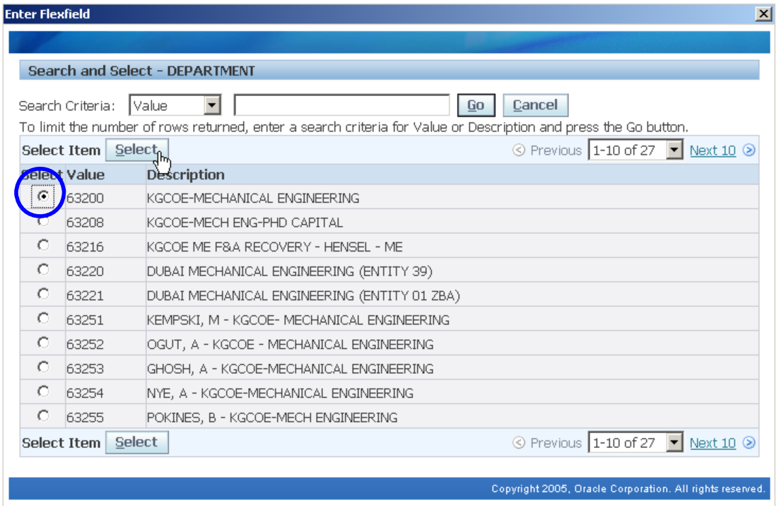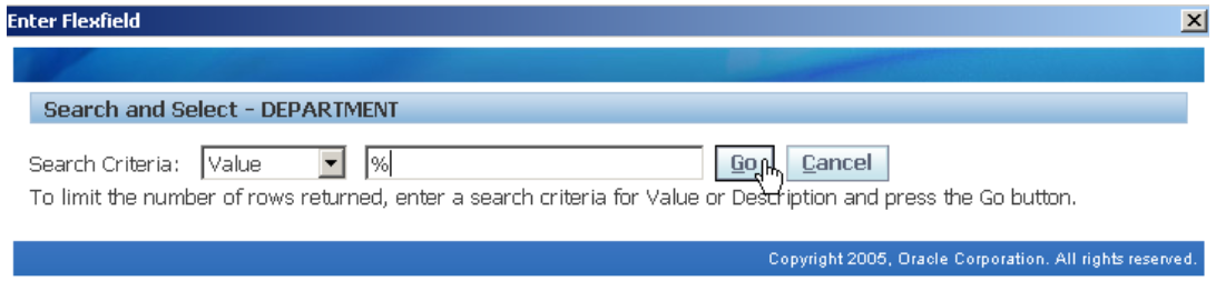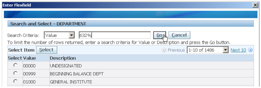 - If you know the first couple characters of the segment value, you can see a reduced list of values by using the wildcard character. For example; you know the Mechanical Engineering department number you want to enter starts with “632”. Enter “632%” in the “Search Criteria” field and click on the “Go” button. A reduced list of values starting with department number “63200” will display for you to choose from.
