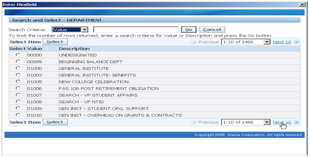 - To see an entire list of all the values for a segment, enter the wildcard character into the “Search Criteria” field and click on the “Go” button. The entire list of values will display in groups of 10.
