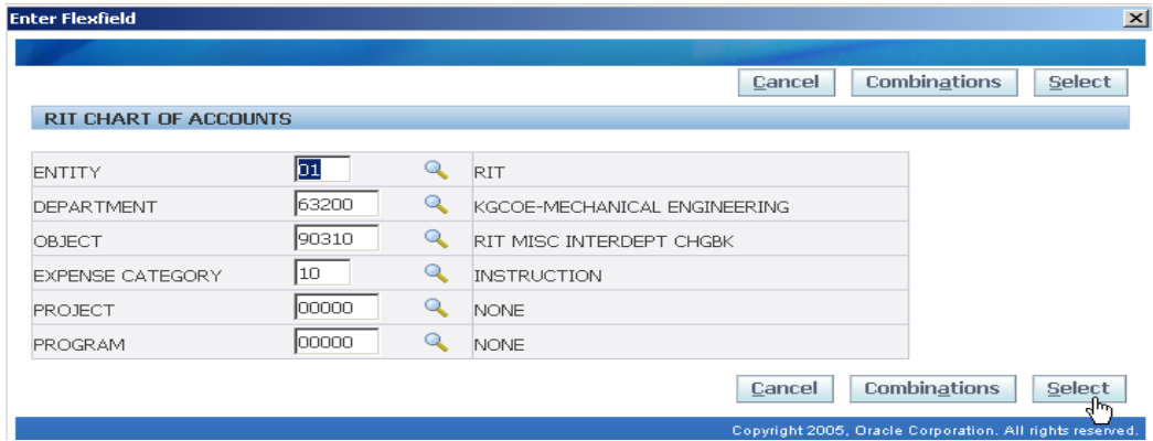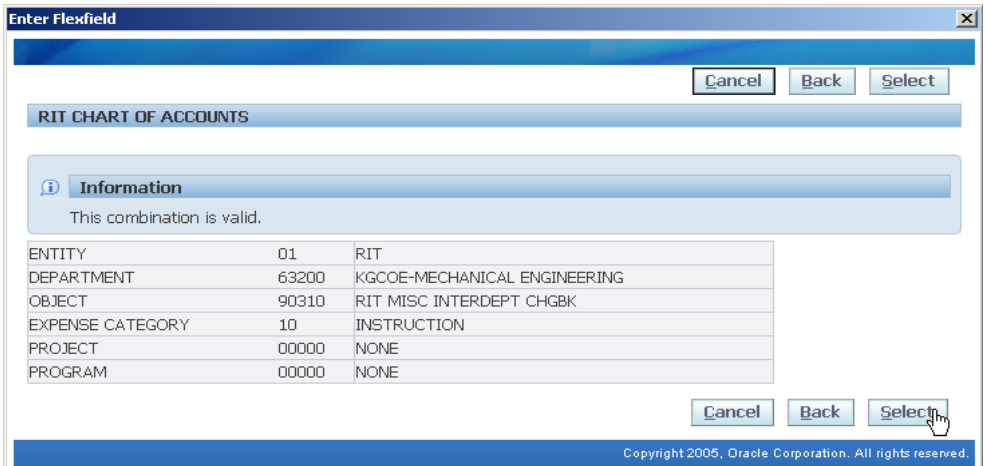 - An “Accounting Flexfield” window will display a list of 24 digit account combinations to choose from. Select the account you want to enter, click on the “Select” button, and the values are entered into the fields on the “Enter Flexfield” window.