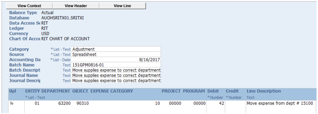 - Batch Name – The Batch Name follows the RIT batch naming convention, first 3 numbers of a user’s dept. number, followed by his/her initials, the month, day and the number of the batch for the day, (i.e.: 151GPM0816-01). After the journal entry is uploaded into the general ledger, the source, balance type and request id are added to the batch name, (i.e.: 151GPM0816-01 Spreadsheet A Spreadsheet A 9262888 17256059). *If you are doing a journal entry during the first two days of a month that is to be posted for the prior month, make sure you name your batch as of the last day of the month. For example on September 2nd you prepare a journal entry for August, your batch name is 151GPM0831-01